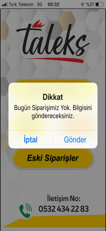TALEKS GIDA firma bayi personeli bu uygulama ile hızlı sipariş verebileceklerdir. Bayi personelinin telefonuna ve adına giriş yapıp onay bekleyeceklerdir. Onay Taleks tarafından size ulaştırılacaktır. Demo için kayıt bölmesine dokunmadan doğrudan kaydınız yapın.